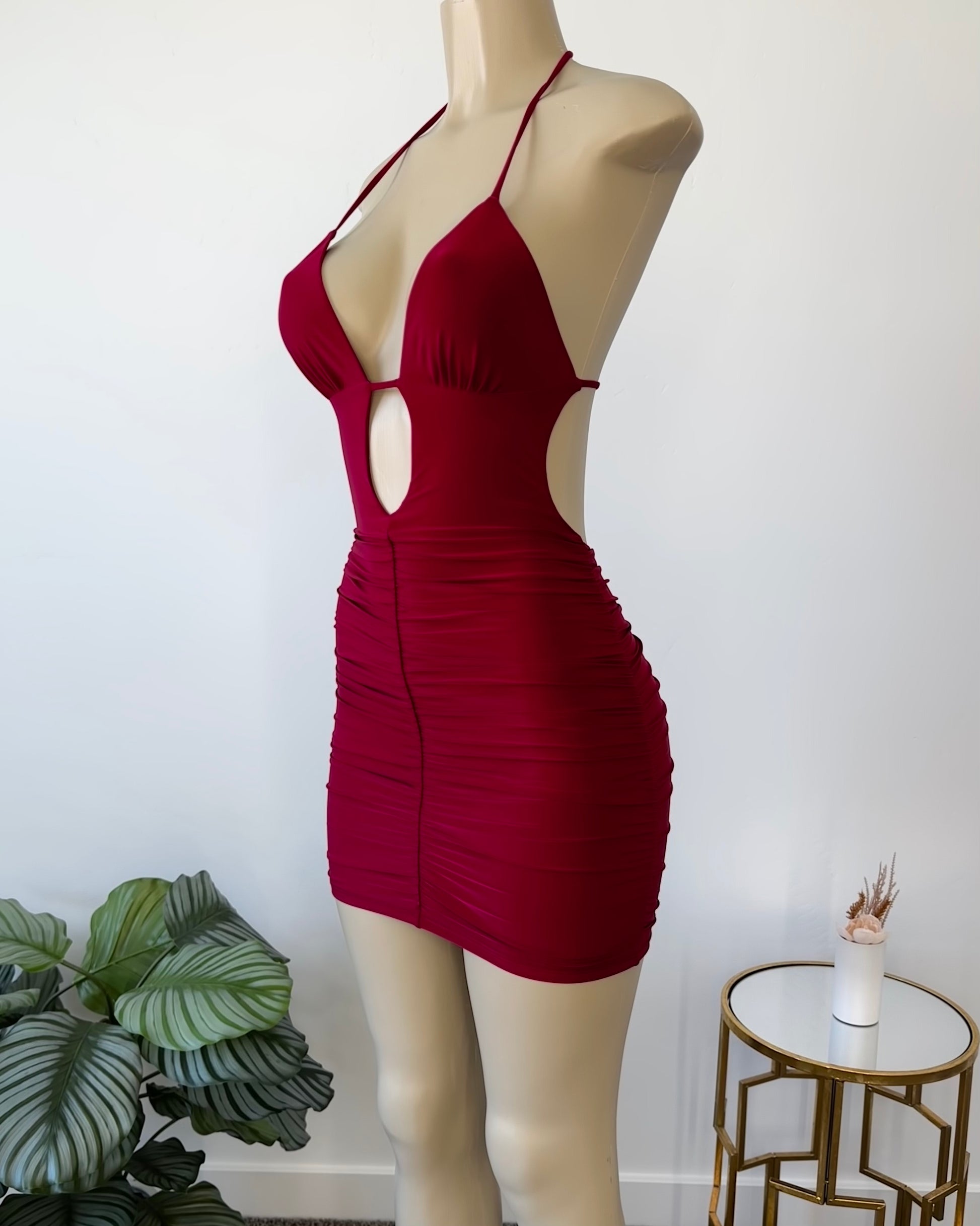 burgundy red wine halter deep plunge open back mini dress, double layered, medium stretch