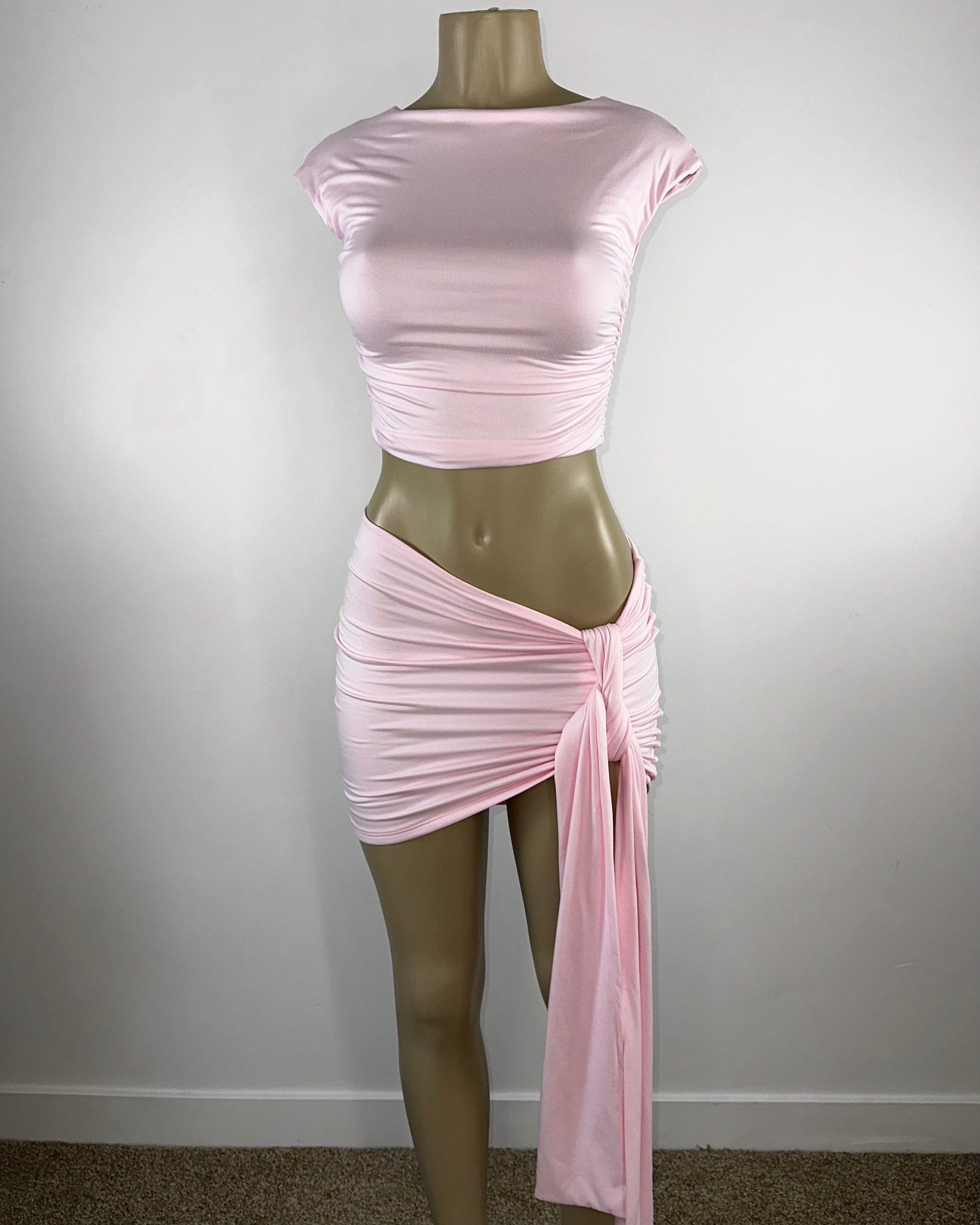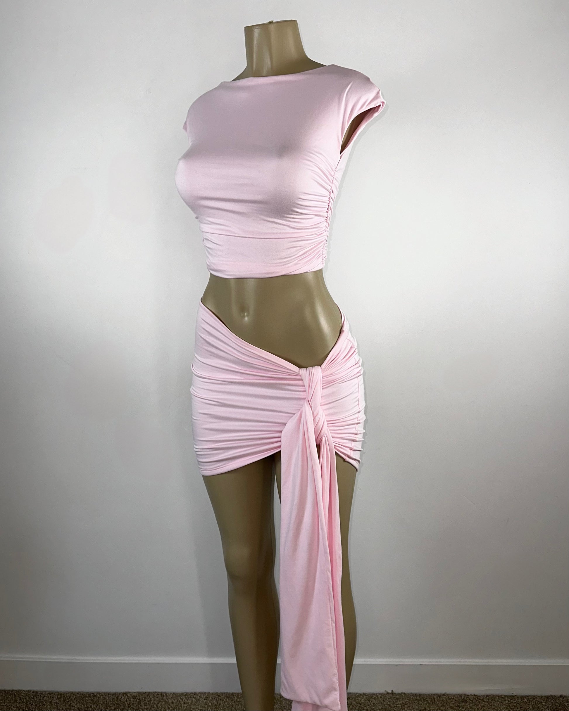 Double layered, light pink buttery material, high waisted mini skirt w/ string creating knot or bow, matching top with ruched on the sides, fabric allows stretch