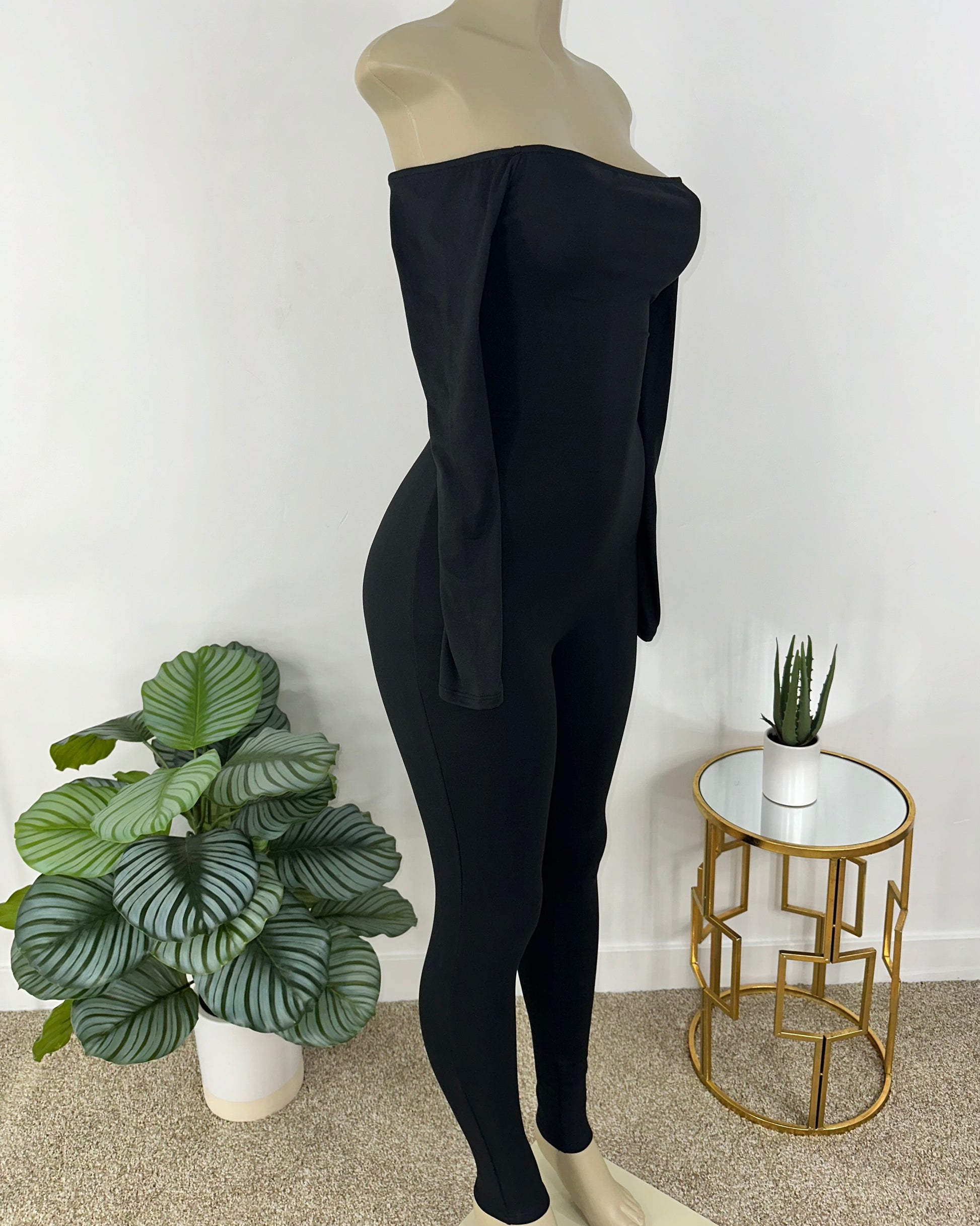 Black long sleeve, off the shoulder, full length jumpsuit, true to size, stretchy