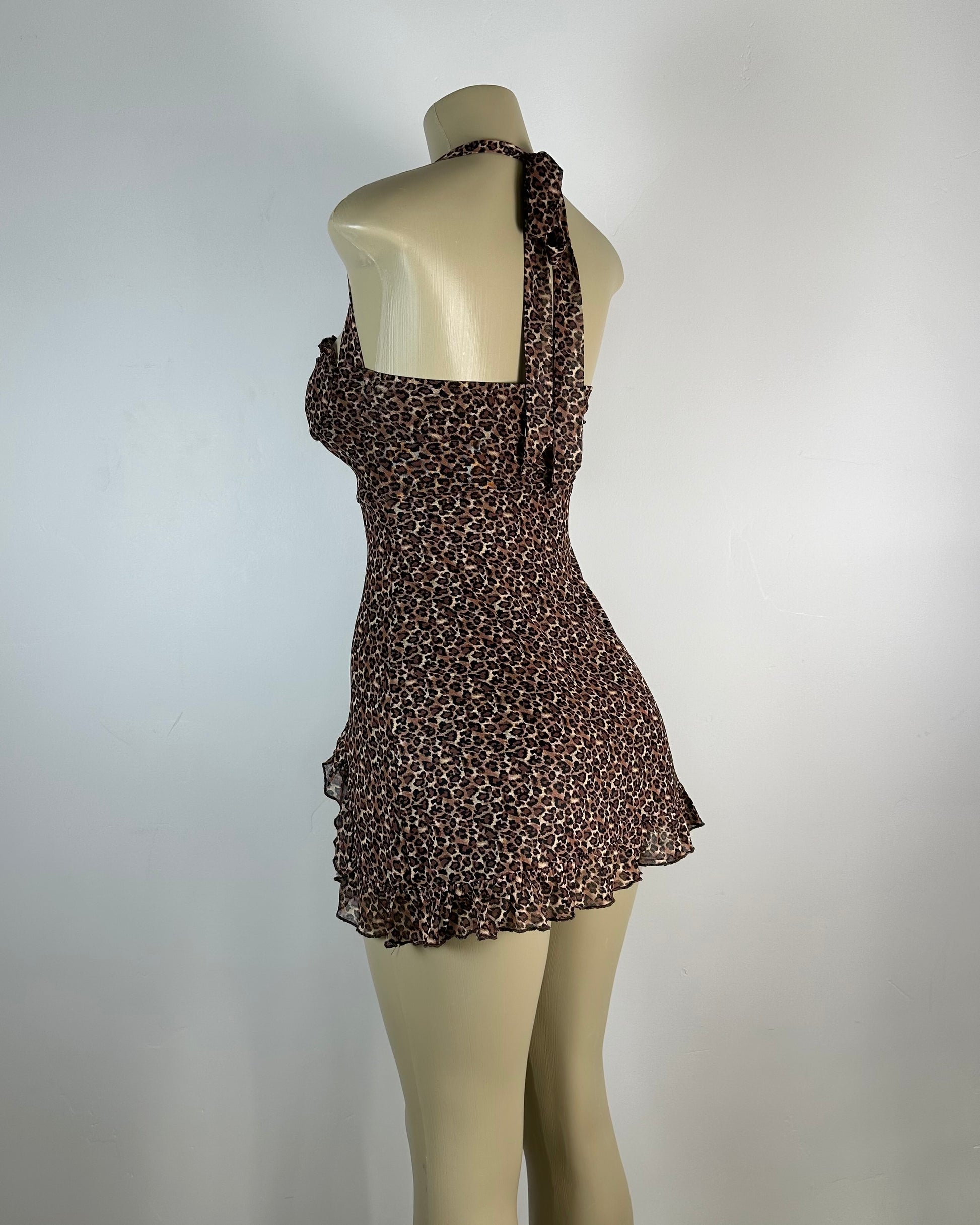 Leopard print mini dress, sweetheart halter neckline, bow detail on front, side zipper, fully lined